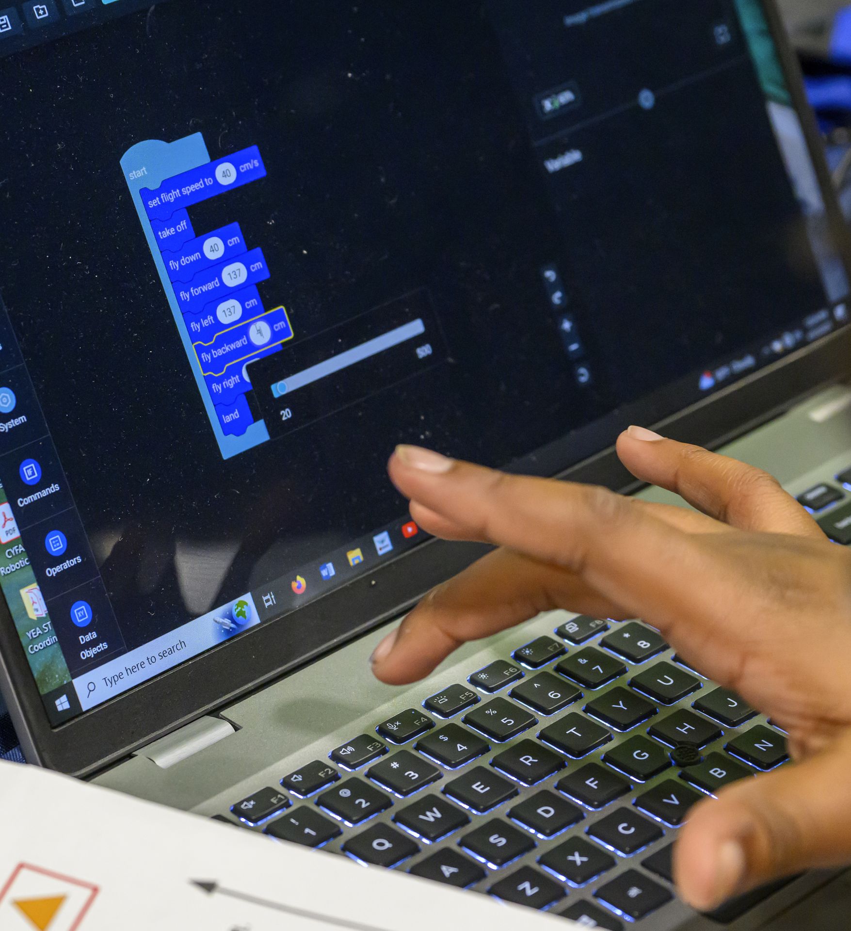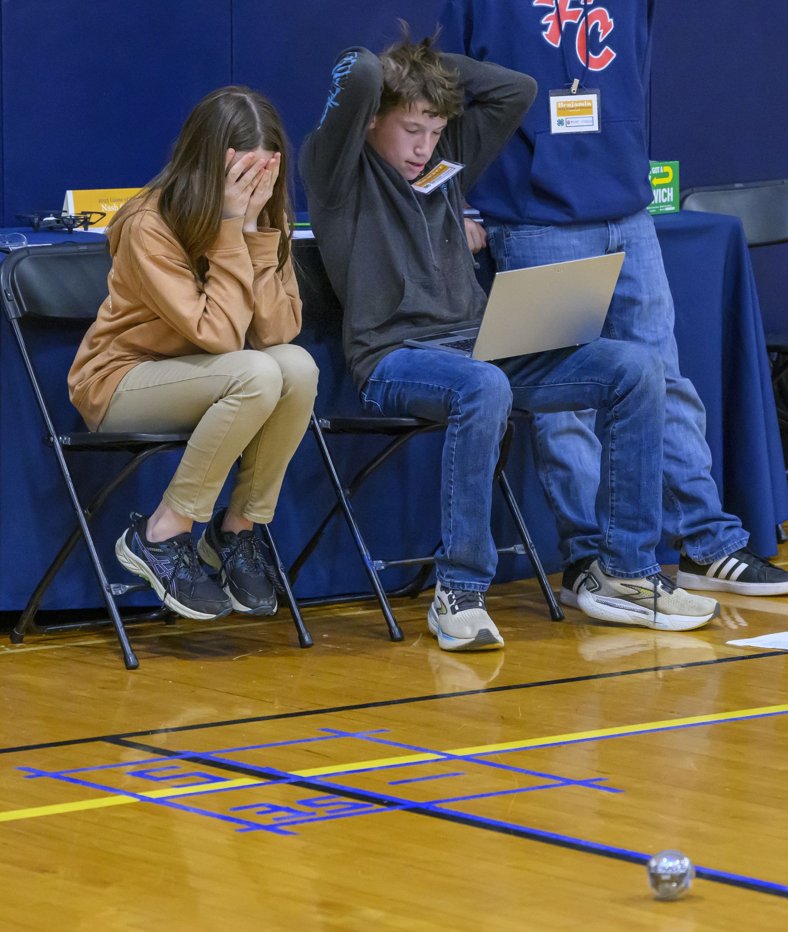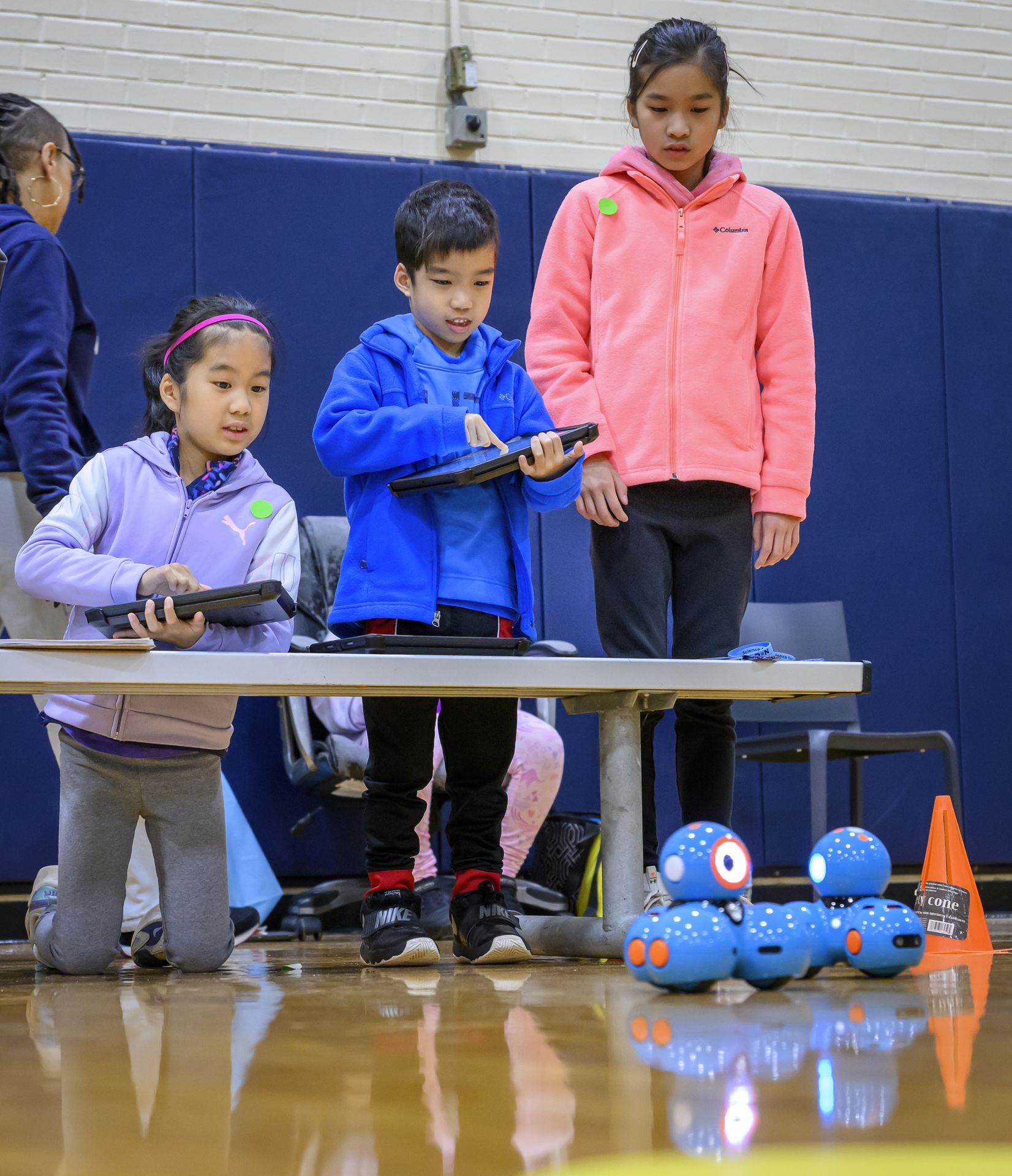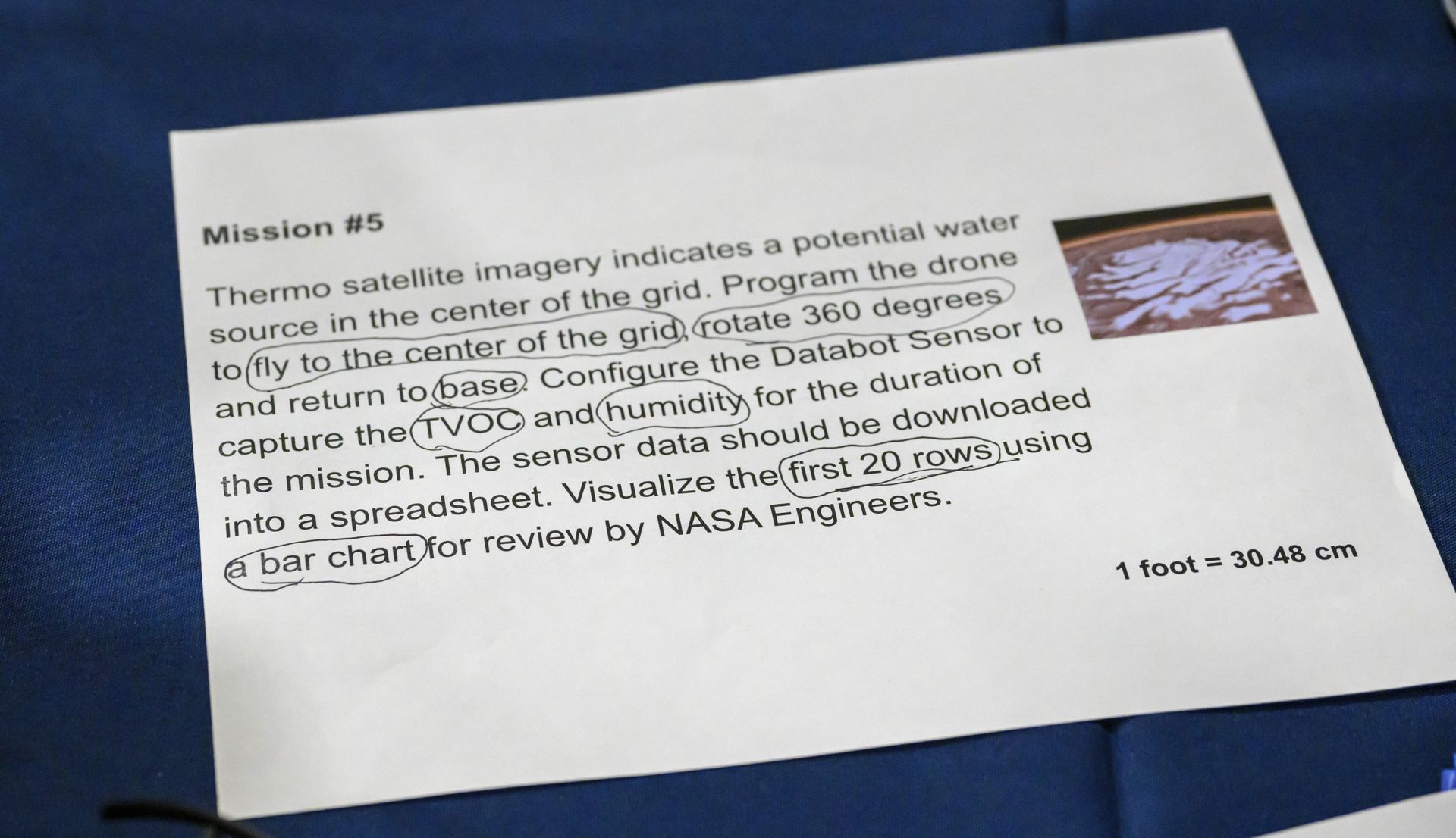 In land and aerial-based challenges, the five high school and nine middle school groups were given eight missions to decipher a mission, then write code using Python and JavaScript to navigate rolling and aerial drones to different points on a 9×9 ft grid, scoring points for accuracy.