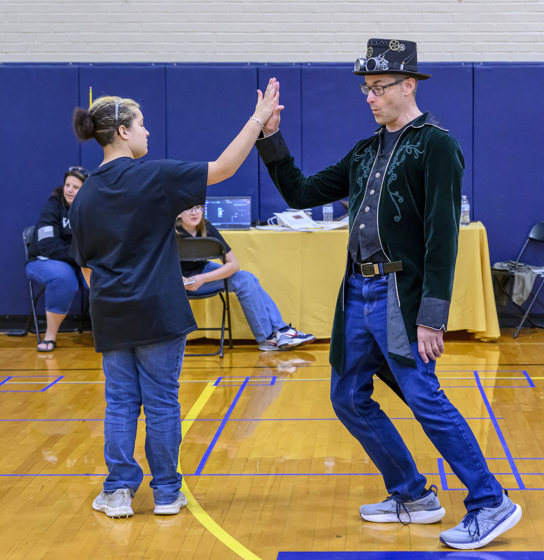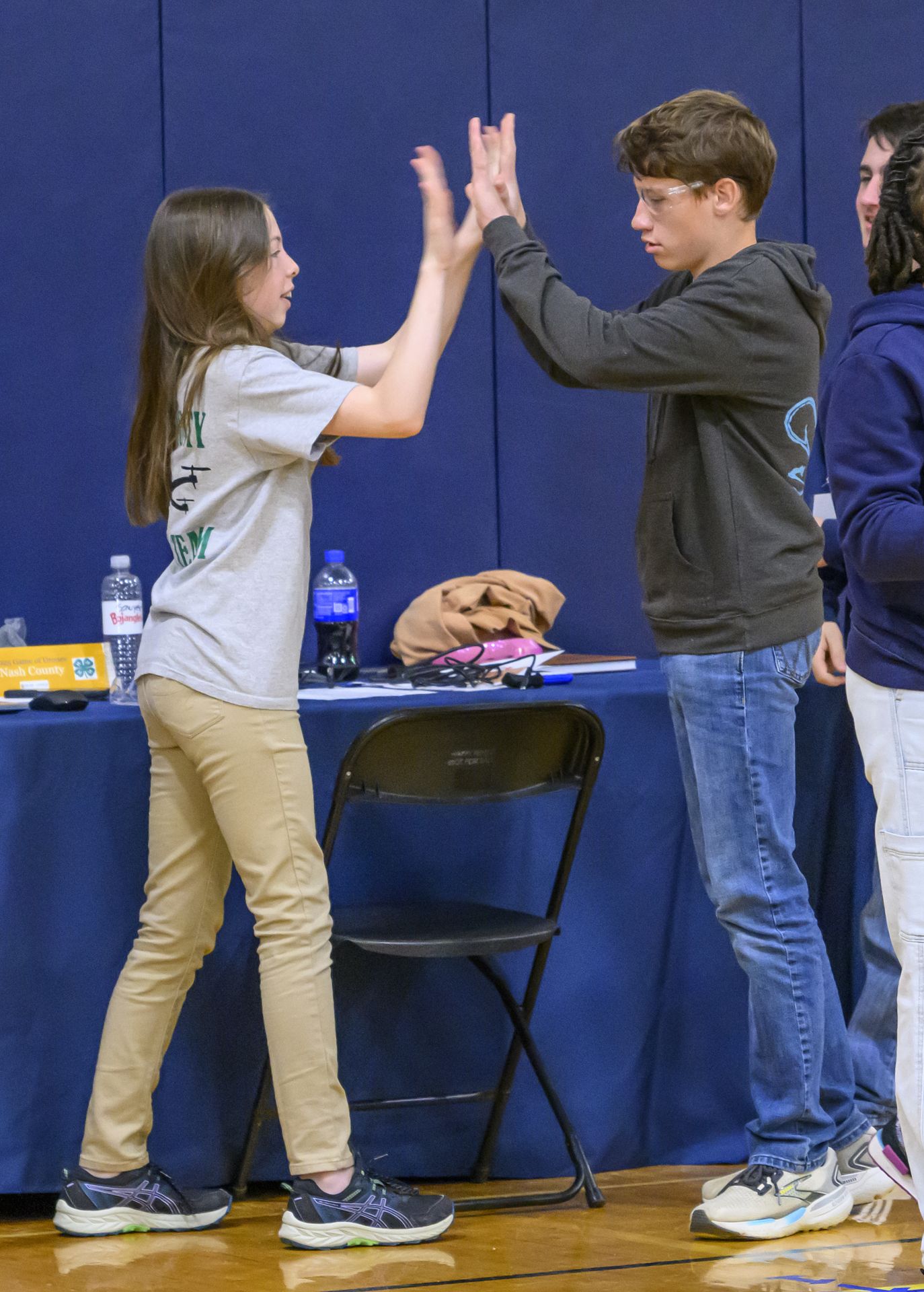 Two boys wearing safety goggles and matching blue shirts touch palms together in a gymnasium, engaging in a team-building activity. Another child stands nearby, watching.