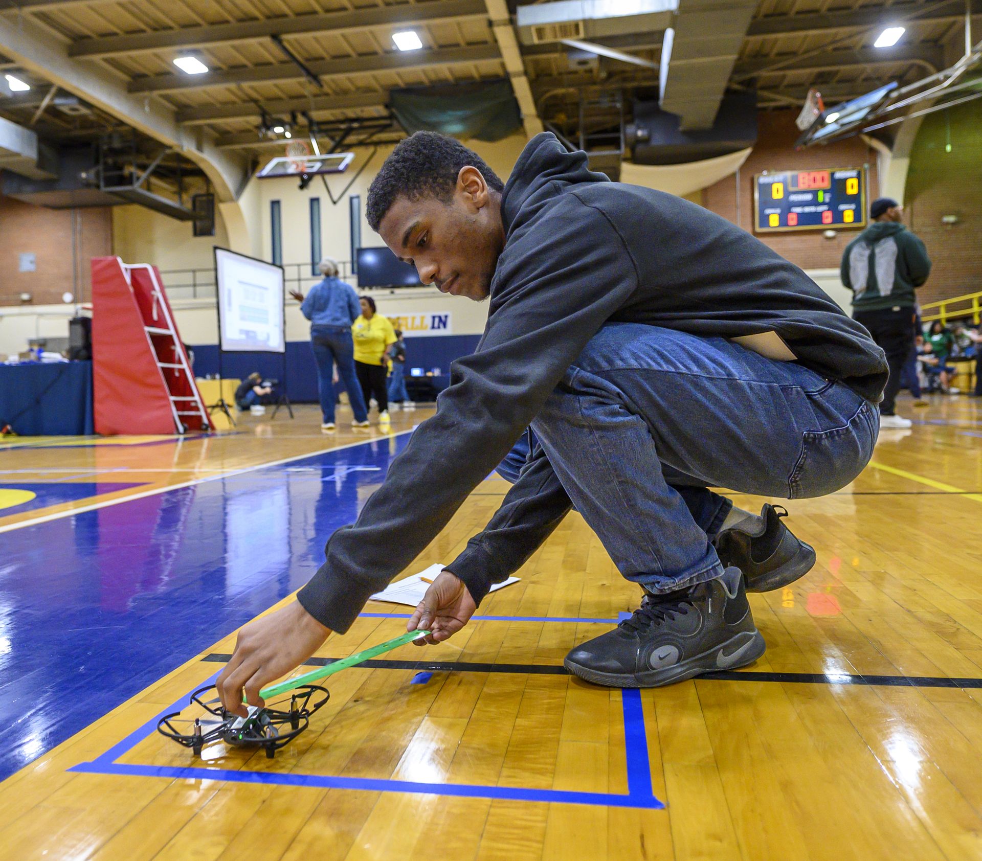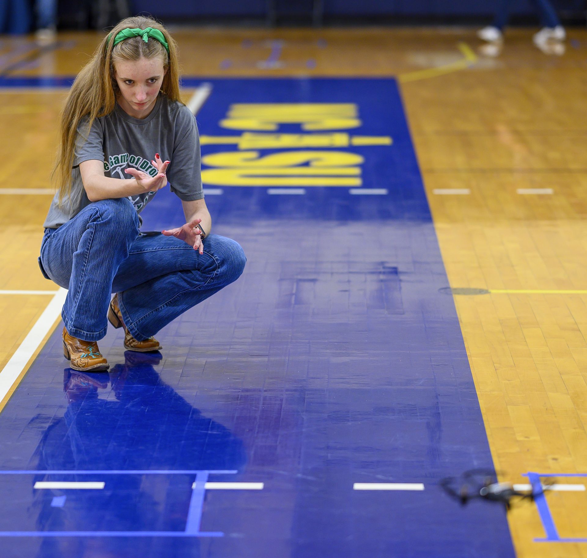 Union County High School team member Cora Medlin tries to coax her team’s drone during a challenge in the Game of Drones competition in Moore Gym on the campus of N.C. A&T SU.