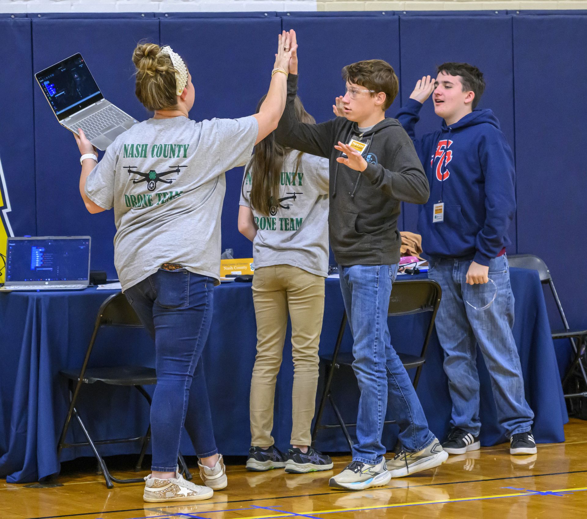 Vance County Middle School teammates William Schubert, left, and Joseph Freeman high-five after completing a challenge in the Game of Drones competition in Moore Gym on the campus of N.C. A&T SU.
