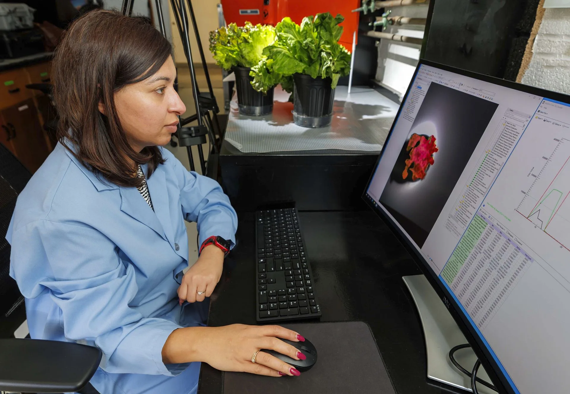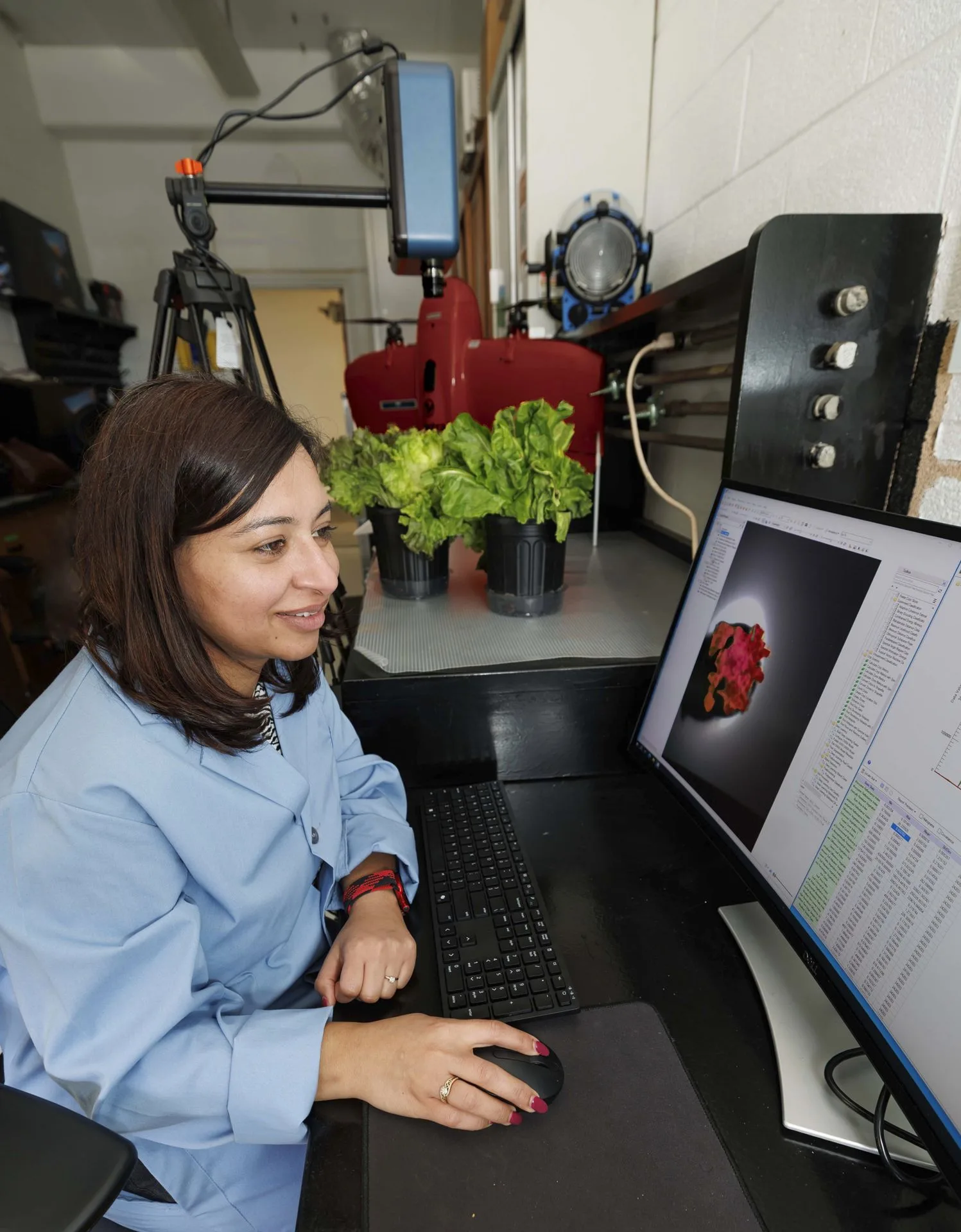 Harmandeep Sharma, Ph.D., uses hyperspectral imaging to collect biochemical data from looseleaf lettuce. She has secured a $260,533, two-year Agriculture and Food Research Initiative grant that will help her create a database to help identify and predict cold-tolerant varieties of the lettuce.
