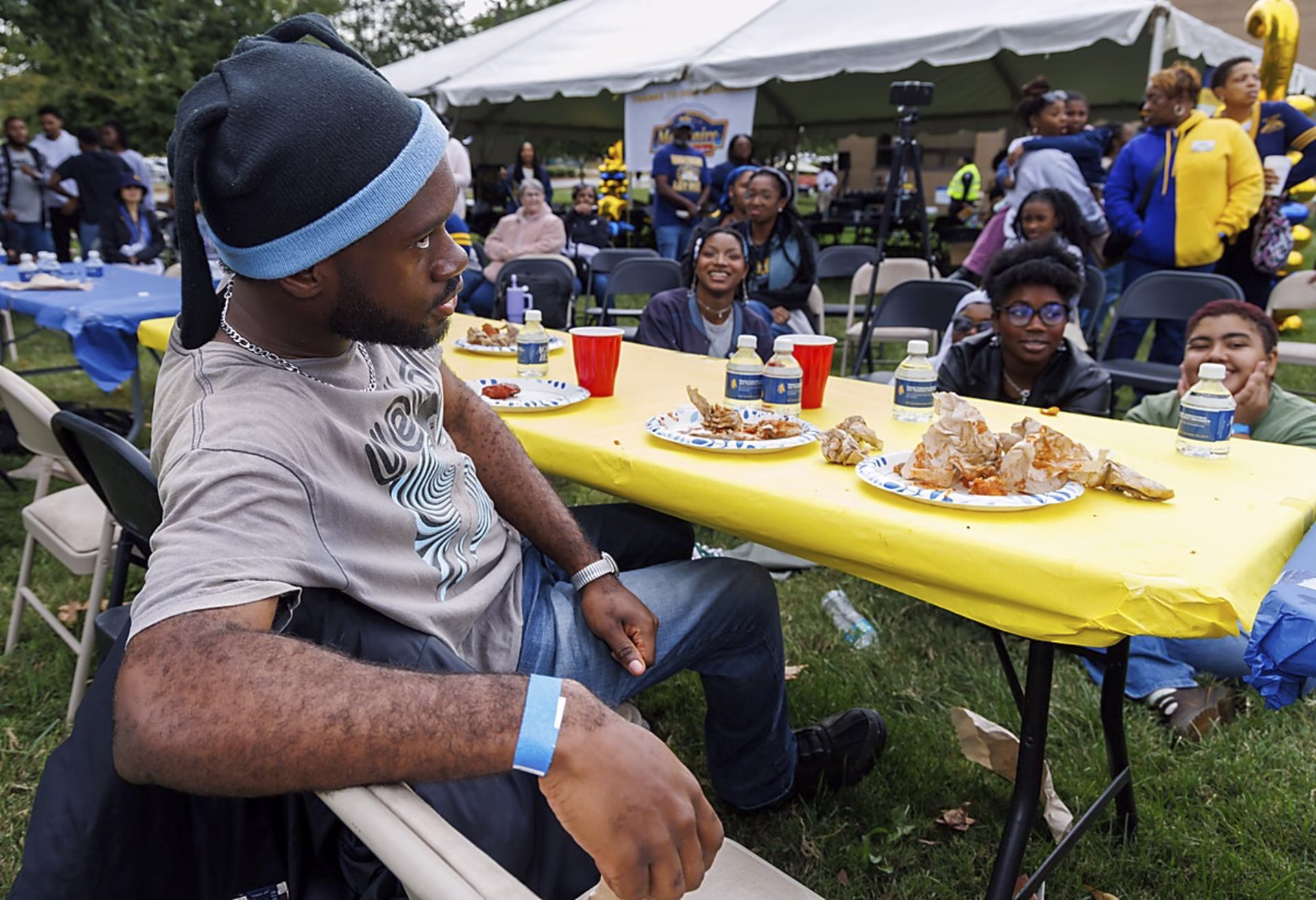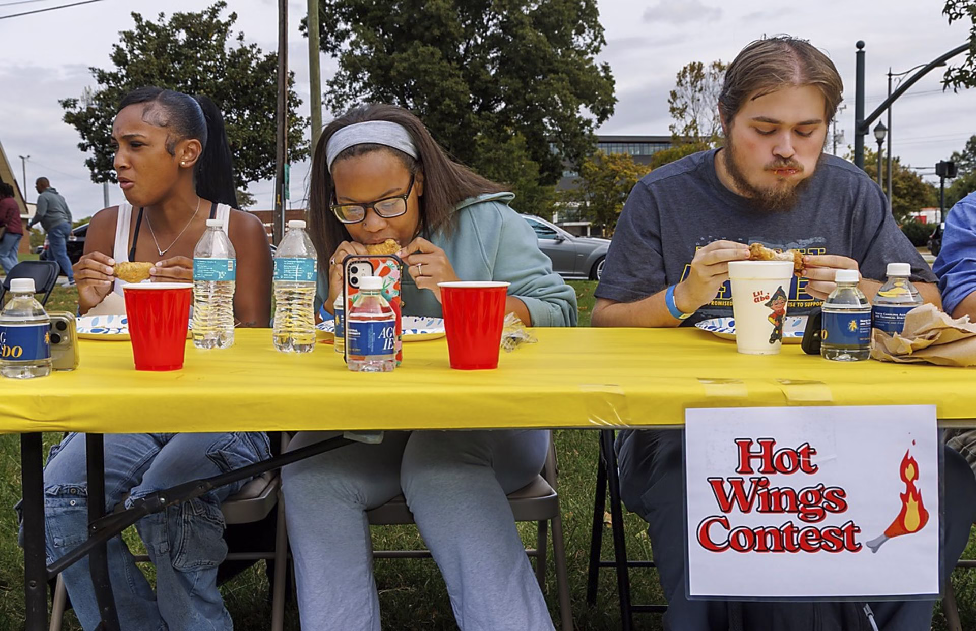 Dominic Jones competes during the Hot Wings Challenge at the CAES Homecoming picnic at Webb Hall.