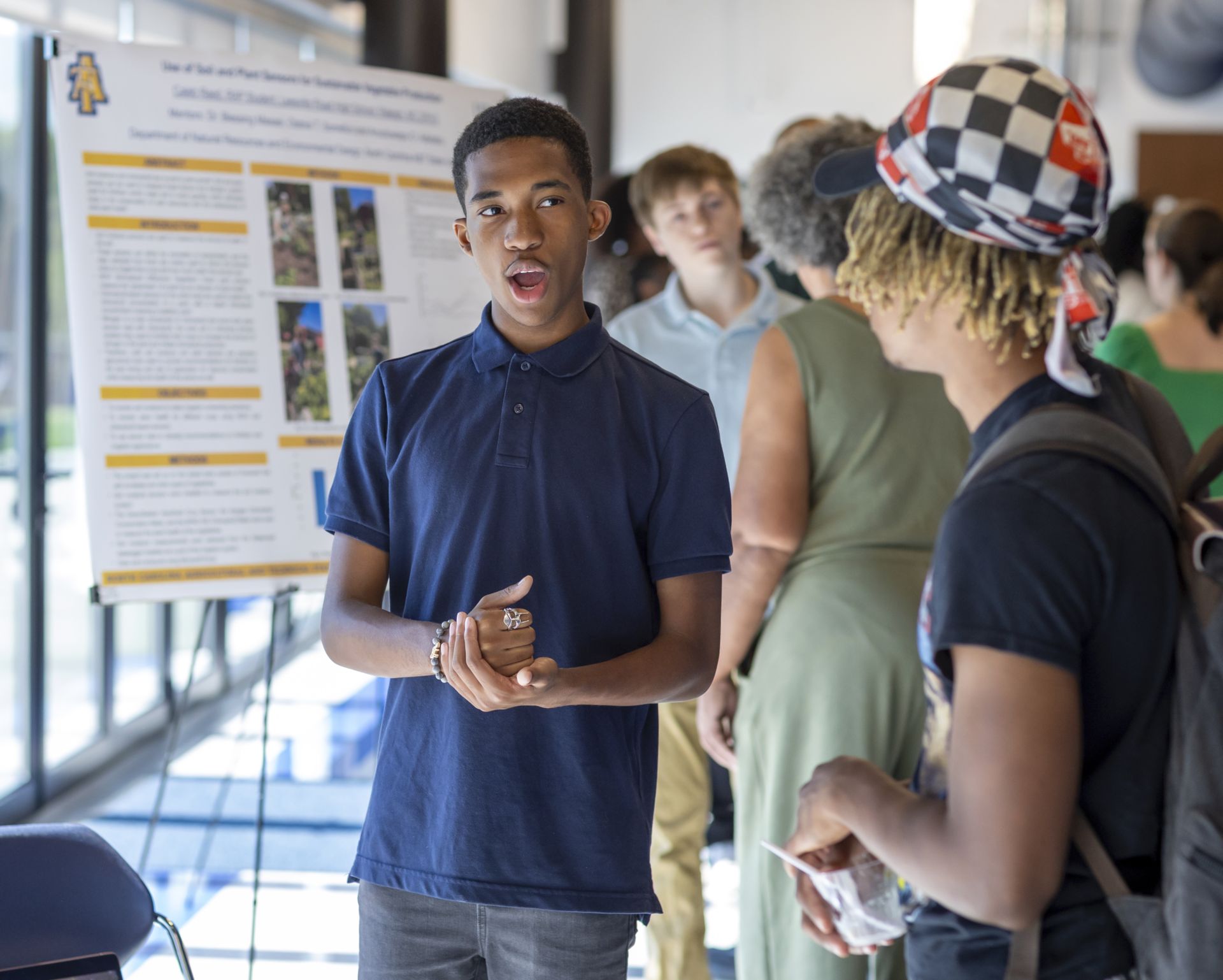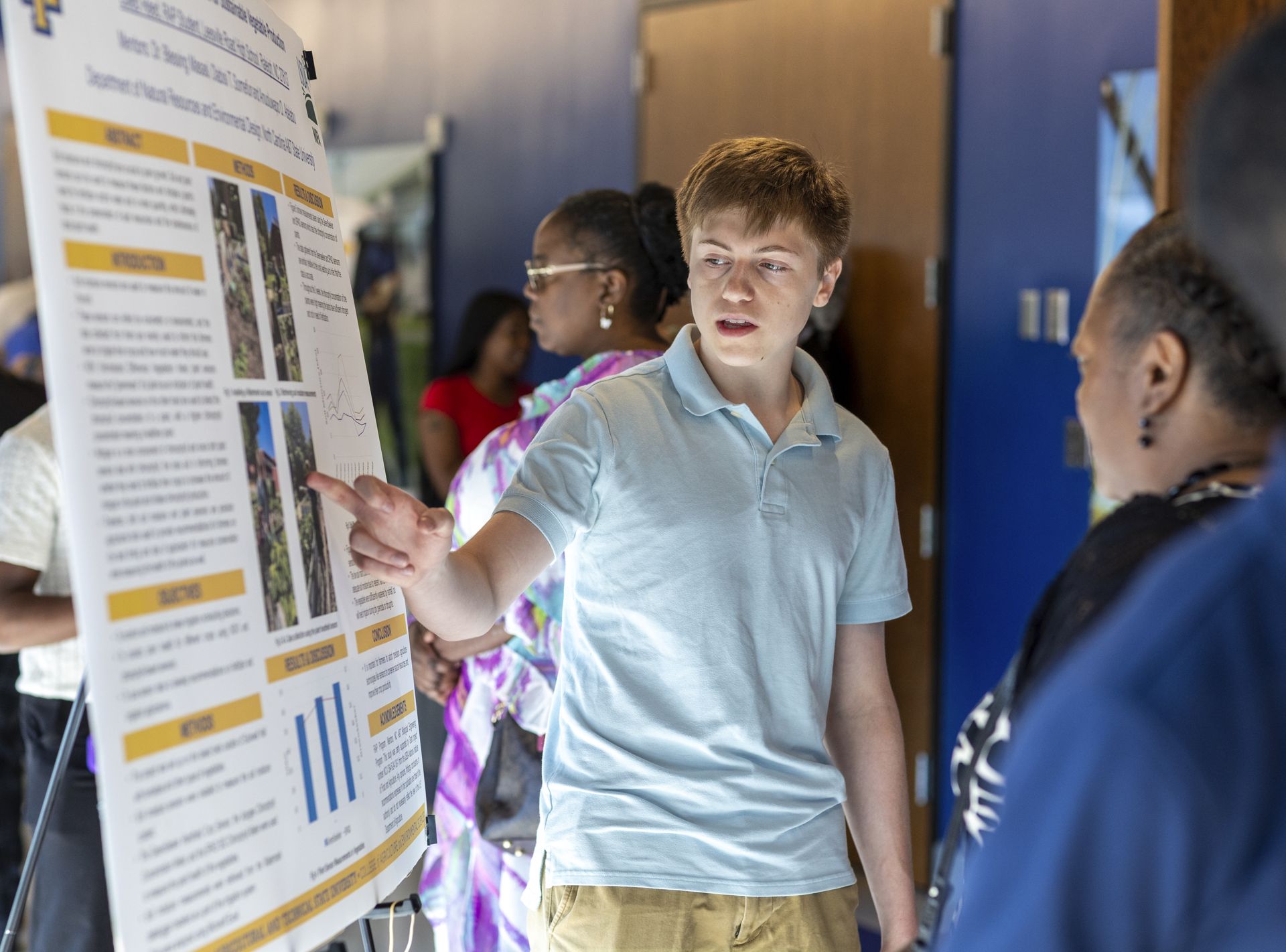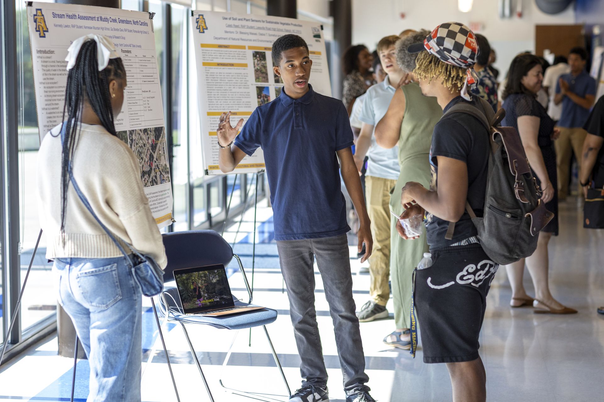 Javier Hernandez, rising senior at Long Reach High School in Columbia, Maryland, discusses his Research Apprenticeship Program (RAP) project with parents and friends during the program’s last day. The two-week summer program gives students exposure to life on campus, research projects and new student interactions.